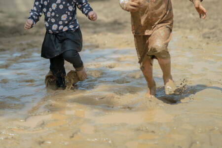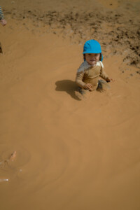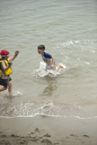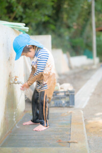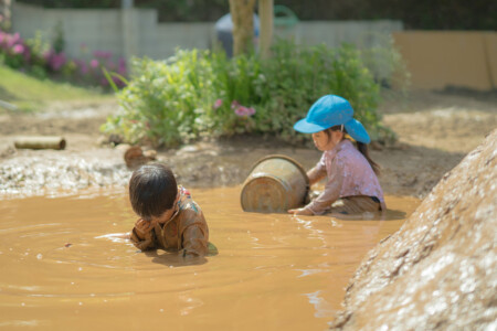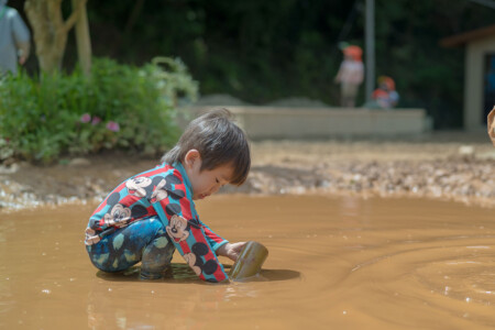 水遊びは子どもたちが大好きな遊びのひとつです。水たまりに入ったり雨に打たれたりしながら全身で楽しみます。水との関わりは心が開かれ緊張感なく気持ちよく取り組めるのです。あゆみこども園では近くの海や雨の時にできる川も楽しい遊び場になります。