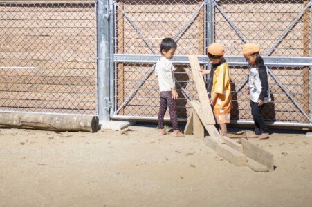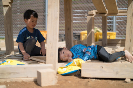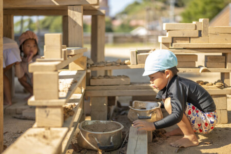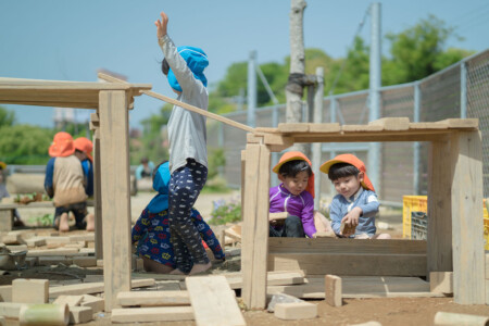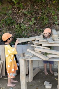 木材を色んなものに見立てて子どもたちは遊びます。並べて道を作ったり、積んだり、敷きつめたり重ねたりしながら家や基地作りにつながっていきます。自分たちで作った居場所は格別です。大人だってワクワクします。