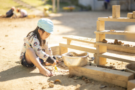 園庭にたくさん用意された土で様々な遊びが生まれます。土山から滑ったり、トロトロの感触を全身で楽しんだり、手先を使って形を作りだしたり…。あゆみこども園ではどろんこ遊びを十分に楽しめます。